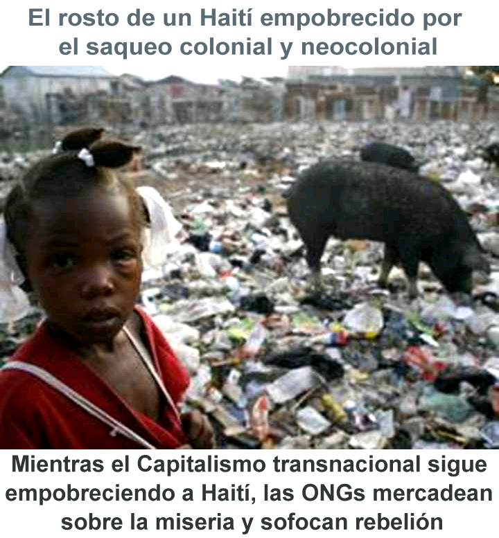 “(…) el cambio de modelo de desarrollo no está planteado en la “reconstrucción” necesitada por EEUU, UE, FMI, el Banco Mundial, y las mega-ONG’s: dado que los unos se lucran de la vulnerabilidad social que les permite saquear recursos y mano de obra a saciedad, mientras los otros necesitan el humanitarismo criminal, por encima de la noción de soberanía de los pueblos, soberanía alimentaria, reforma agraria, y gestión popular de los recursos (…)”